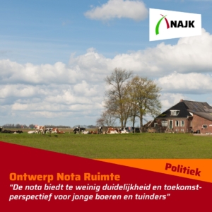 NAJK heeft een zienswijze ingediend op de Ontwerp Nota Ruimte en is kritisch op de koers die het kabinet daarin kiest. Hoewel het kabinet het belang en de meerwaarde van de landbouw expliciet erkent, vertaalt dit zich volgens NAJK onvoldoende in concrete en onderbouwde ruimtelijke keuzes. “De nota biedt te weinig duidelijkheid en toekomstperspectief voor jonge boeren en tuinders,” aldus Merel Straathof, portefeuillehouder Leefomgeving.